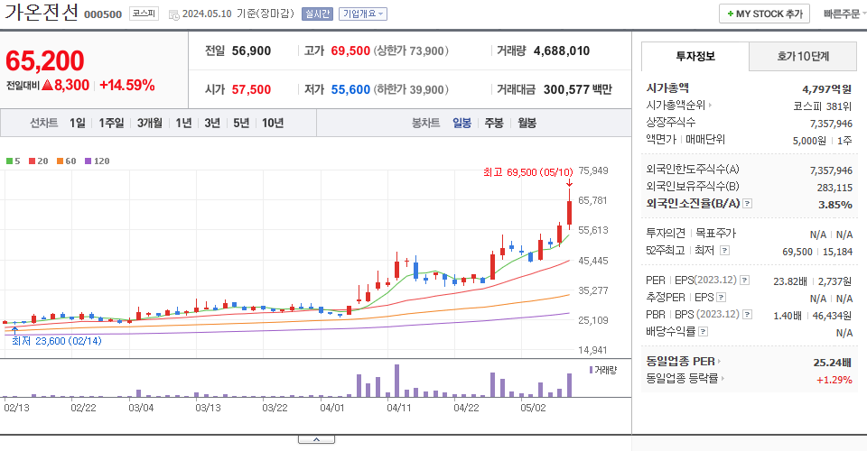 - 2024-05-07 - 1분기 전기기기 수출 호조 소식 등에 전선/ 전력설비 테마 상승 속 상한가