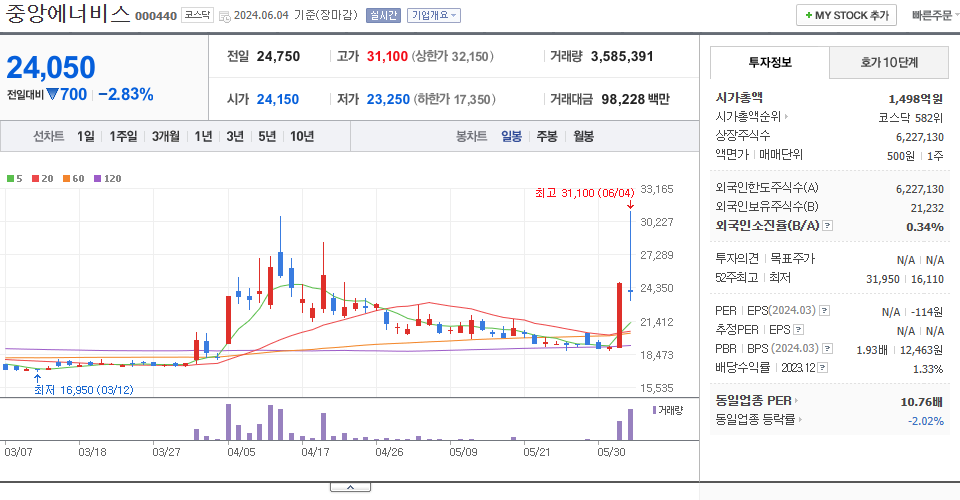 - 2024-06-04 - 尹 대통령, "동해에 140억 배럴 규모 석유·가스 매장 가능성" 발언 모멘텀 지속 속 에너지 관련주로 지속 부각되며 상한가
