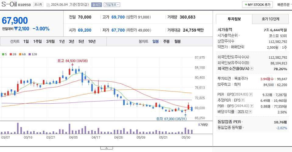 - 2023-06-29 - 신한투자증권은 동사에 대해 2Q23 영업이익은 324억원(-94%, QoQ)으로 컨센서스 3,843억원을 하회할 것으로 전망. 특히, 정유 영업이익은 -2,010억원으로 적자전환이 예상되며, 유가 하락에 따른 재고평가손실(-754억원)과 정제마진 급락으로 실적 둔화가 불가피할 것으로 분석.