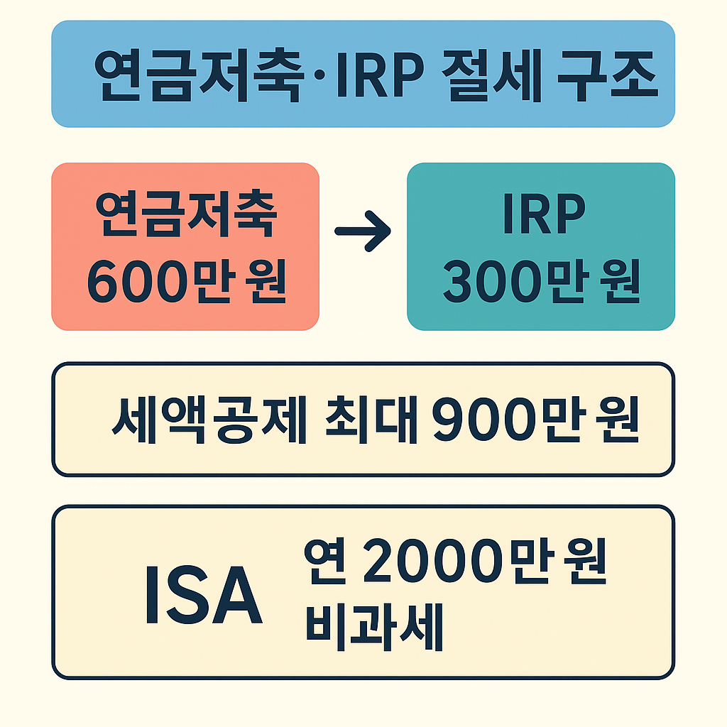 한도는 이렇게 기억하면 돼요. - 연금저축 + IRP 합산 연 900만원까지 세액공제 - 이 중 연금저축은 600만원까지 공제 가능 - IRP는 300만원을 채워 합산 900만원 구조를 완성