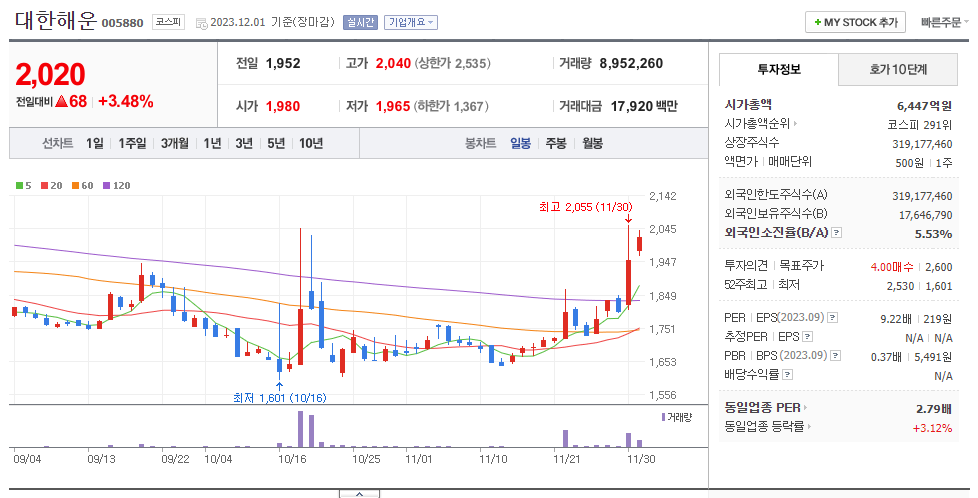 최근 외인과 기관둘다 매수세로 해운주 테마주로써 많이 엮이는 만큼 크게 외인과,기관 매수세가 보이지 않지만 제일 높은 변동을 보이는 해운주!