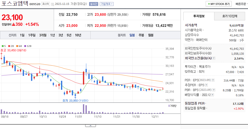 - 2023-11-30 - 포스코그룹 수산화리튬 첫 국내 상업생산 모멘텀 지속 등에 리튬 테마 상승 속 급등