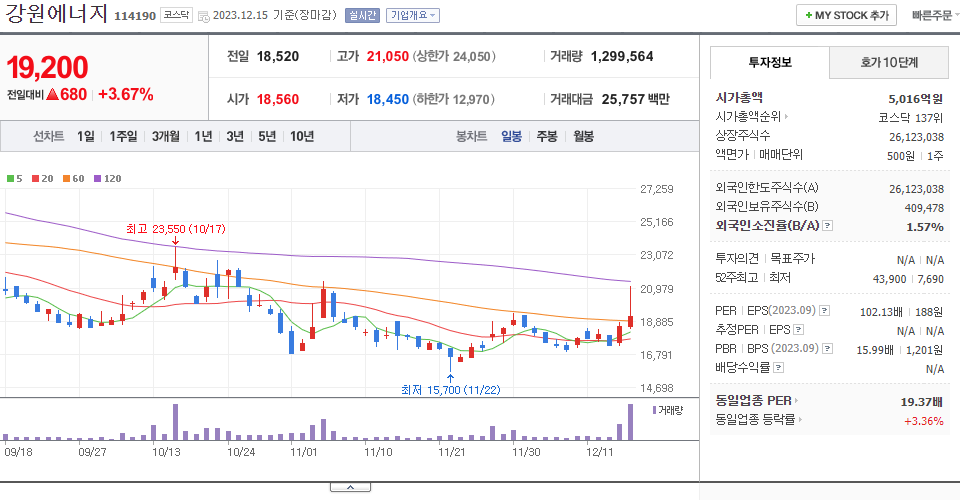 - 2023-11-28 - 자회사 강원이솔루션, 무수수산화리튬 12월 본격 공급 소식 등에 상승