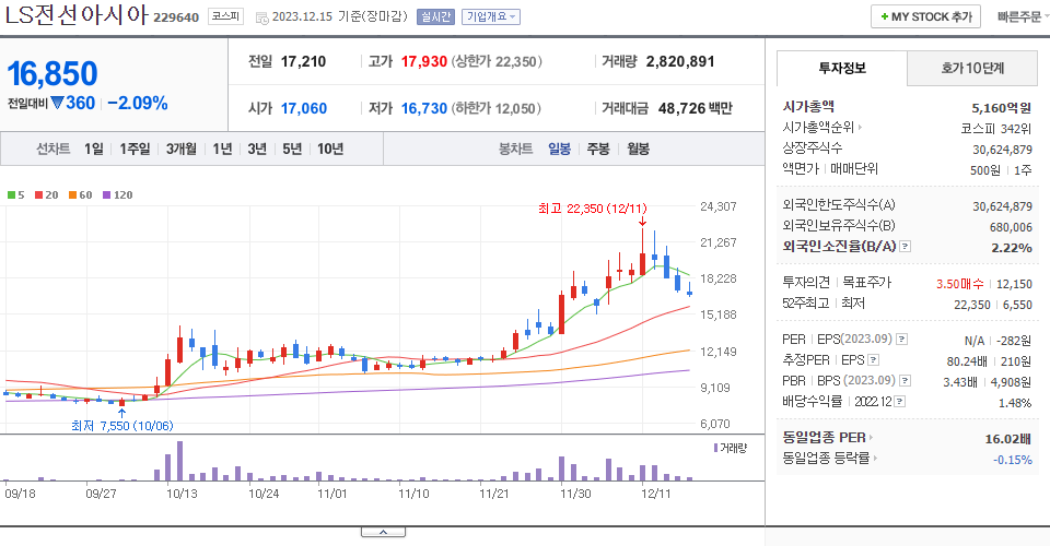 - 2023-10-13 - 계열사 LS전선아시아, 베트남 해저케이블 사업 추진 기대감 및 3분기 실적 기대감 등에 상한가