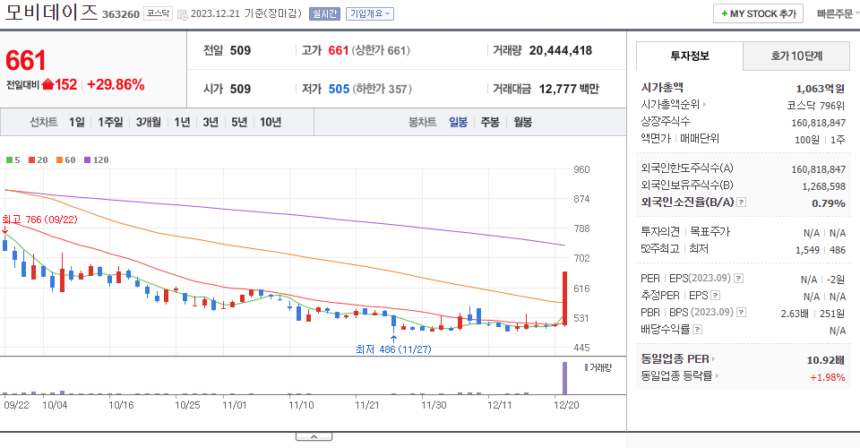 - 2023-06-29 - 170억원 규모 모비콘텐츠테크 주식 추가 취득 결정 속 약세