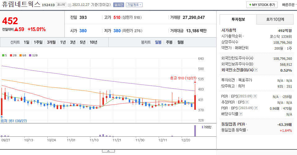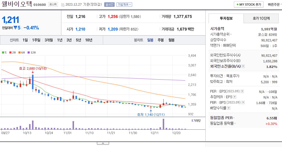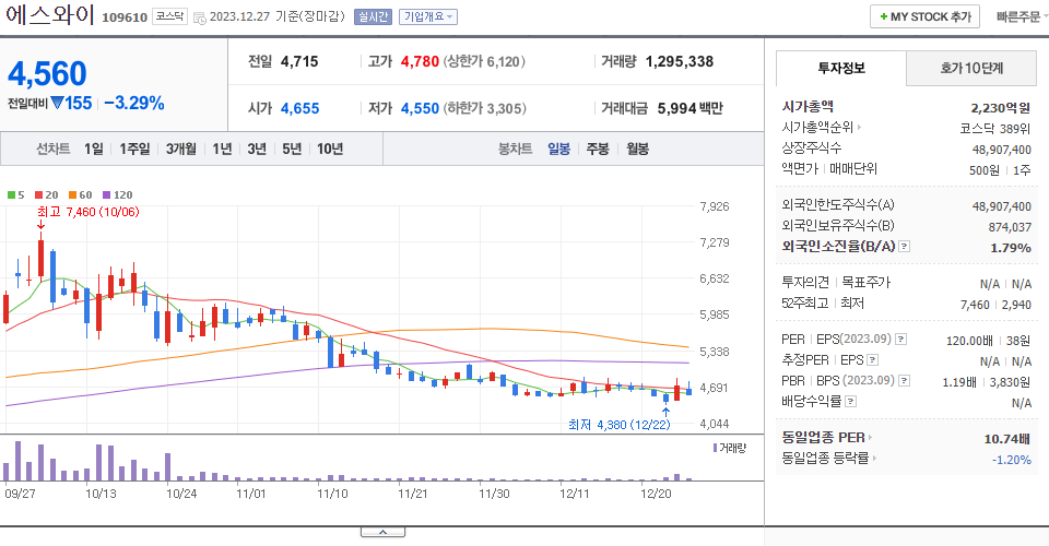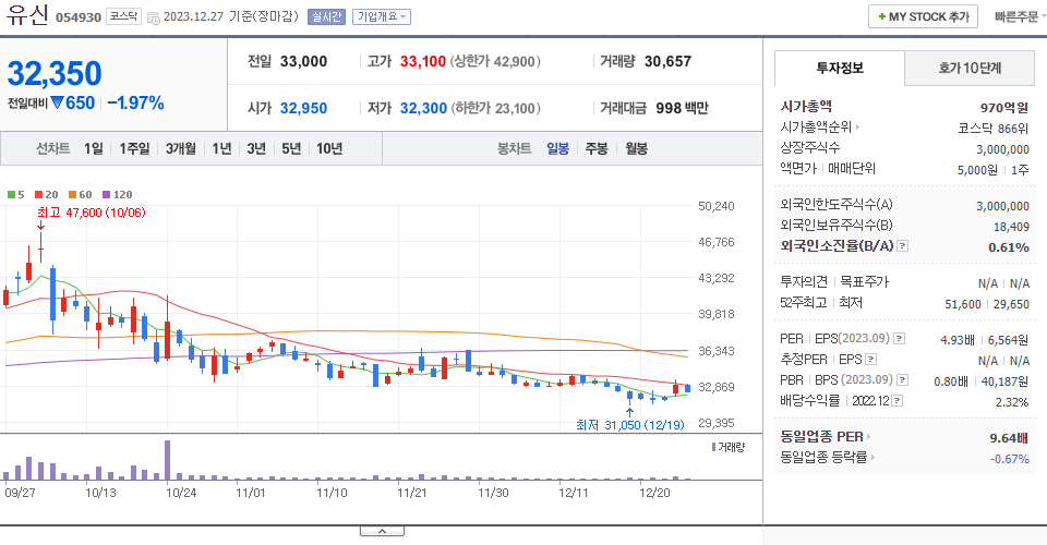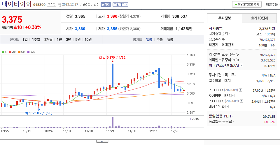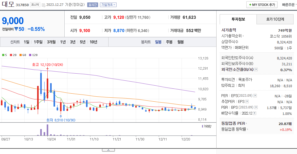 - 2023-12-14 - 전일 장 마감 후 90% 비율의 감자 결정(기준일:2024-01-15, 상장예정:2024-02-02) 공시. 아울러 1주당 가액 5,000원을 500원으로 분할하는 주식분할 결정(상장예정:2024-02-02) 공시.
