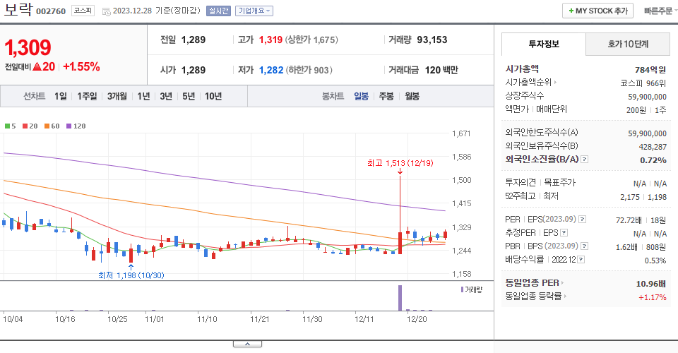동사는 1959년 한국농산공업(주)로 설립되었으며, 사업다각화에 따라 주식회사 보락으로 상호를 변경함. 식품첨가물사업 및 원료의약품사업 등을 주요 사업으로 영위하고 있으며, 상품의 매출과 기타(임가공 외)사업을 영위하고 있음.